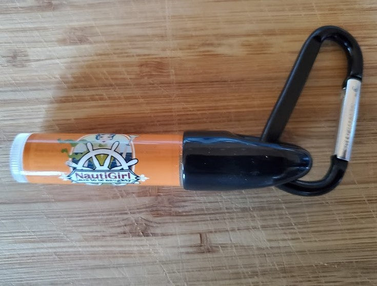 This lip balm is soft, not waxy like chapstick and is made of natural ingredients as well as having an SPF of 15 to keep your lips supple and protected from the sun  in the harsh winds or salty air. It also comes with a handy carabiner clip to keep it readily available on your favorite bag, belt clip or around your neck on a lanyard.